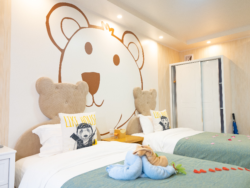 - 床位配置: 1张单人床 (1.3米),1张双人床 (1.5米),1张大床 (1.8米),1张榻榻米 (0.8米),该房型禁烟,可加床。